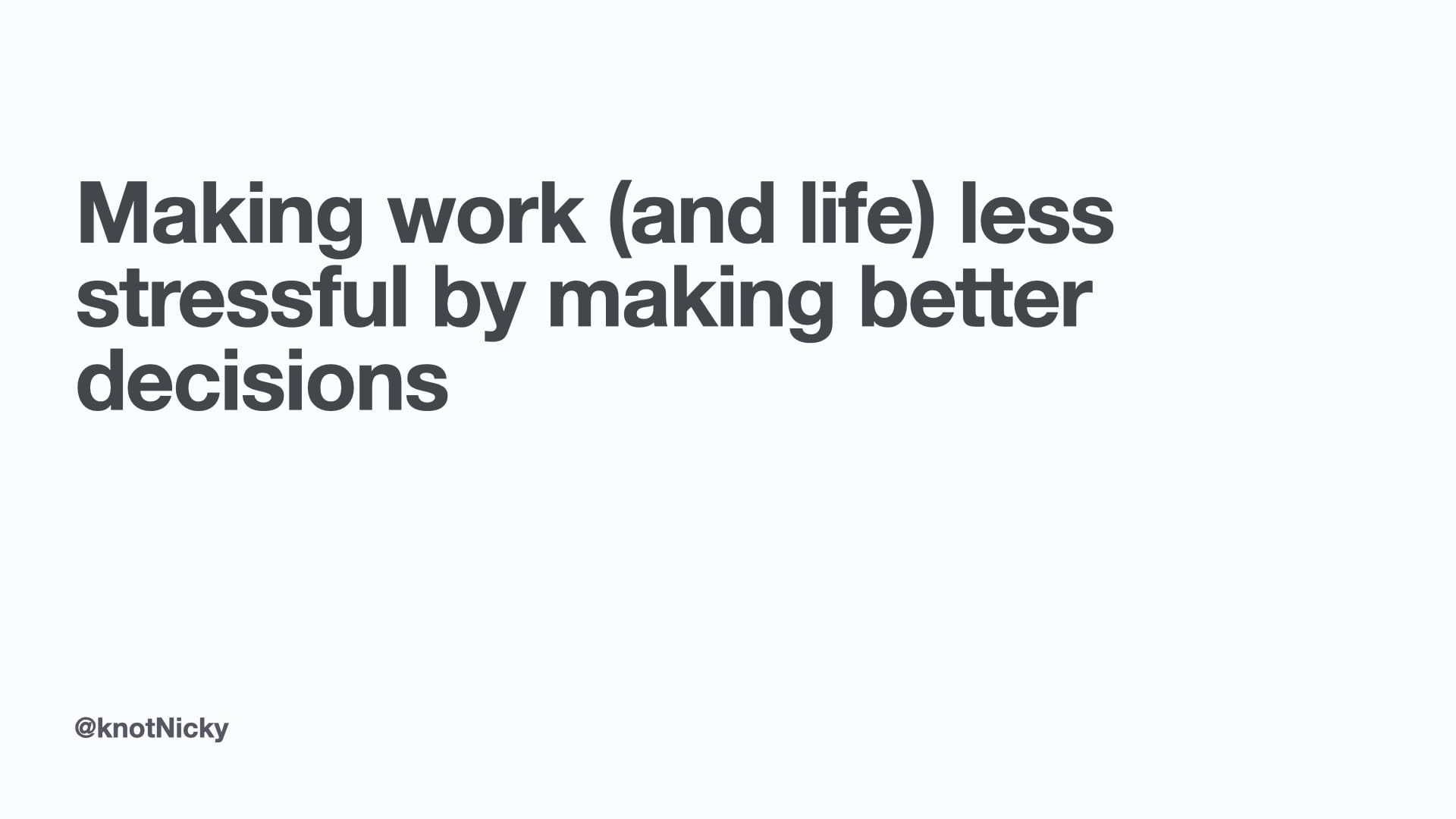 I was very happy to give this talk at Brighton Ruby in 2024. The video is here: https://brightonruby.com/2024/making-work-and-life-less-stressful-by-making-better-decisions-nicky-thomson/ and the slides and transcript are below.