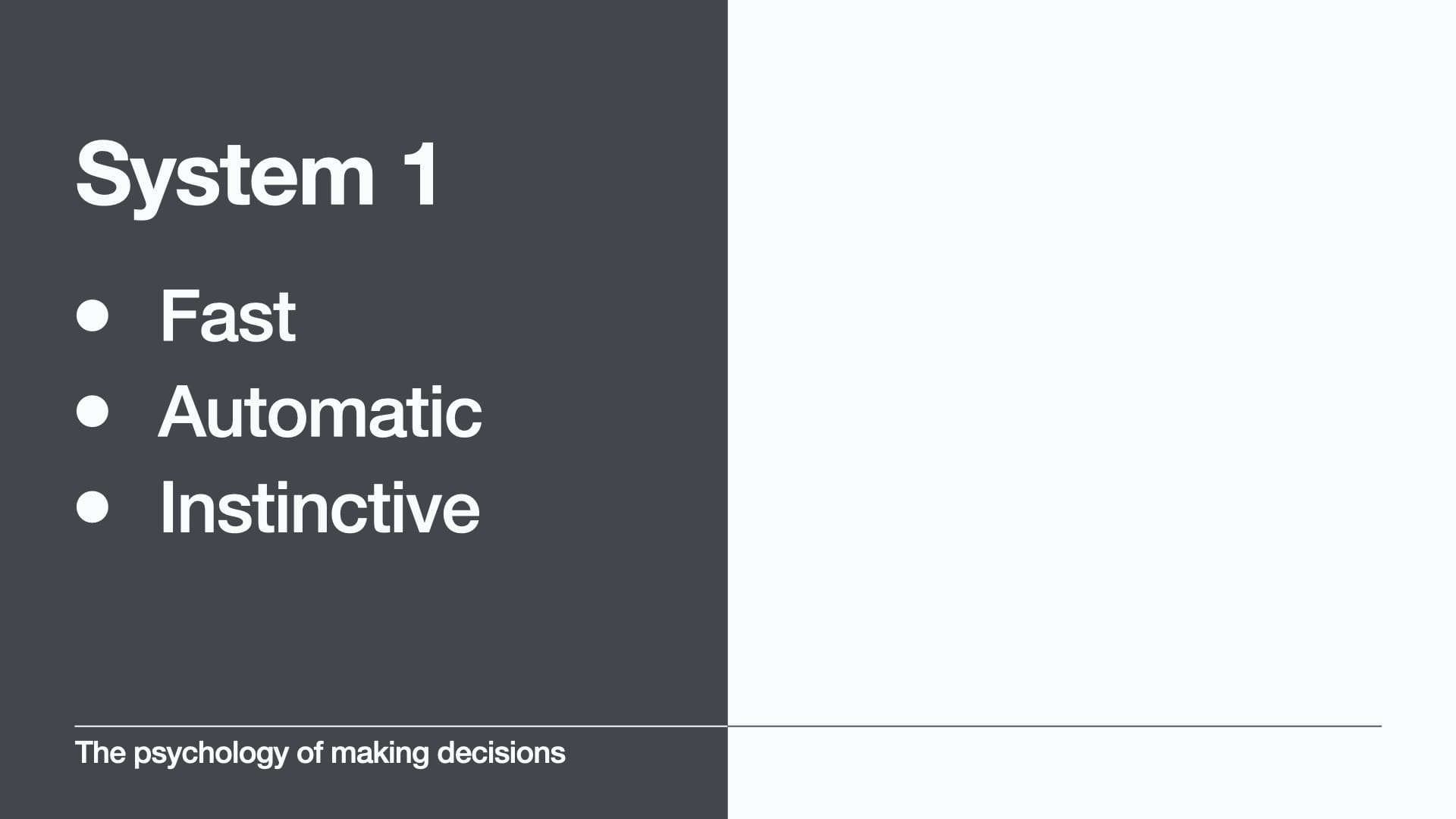 System 1 is fast, automatic, instinctive, and it provides very quick emotional responses. System 1 is what stops you walking into the road because you can hear traffic. System 1 thinking is associated with our amygdala - our fight or flight response.