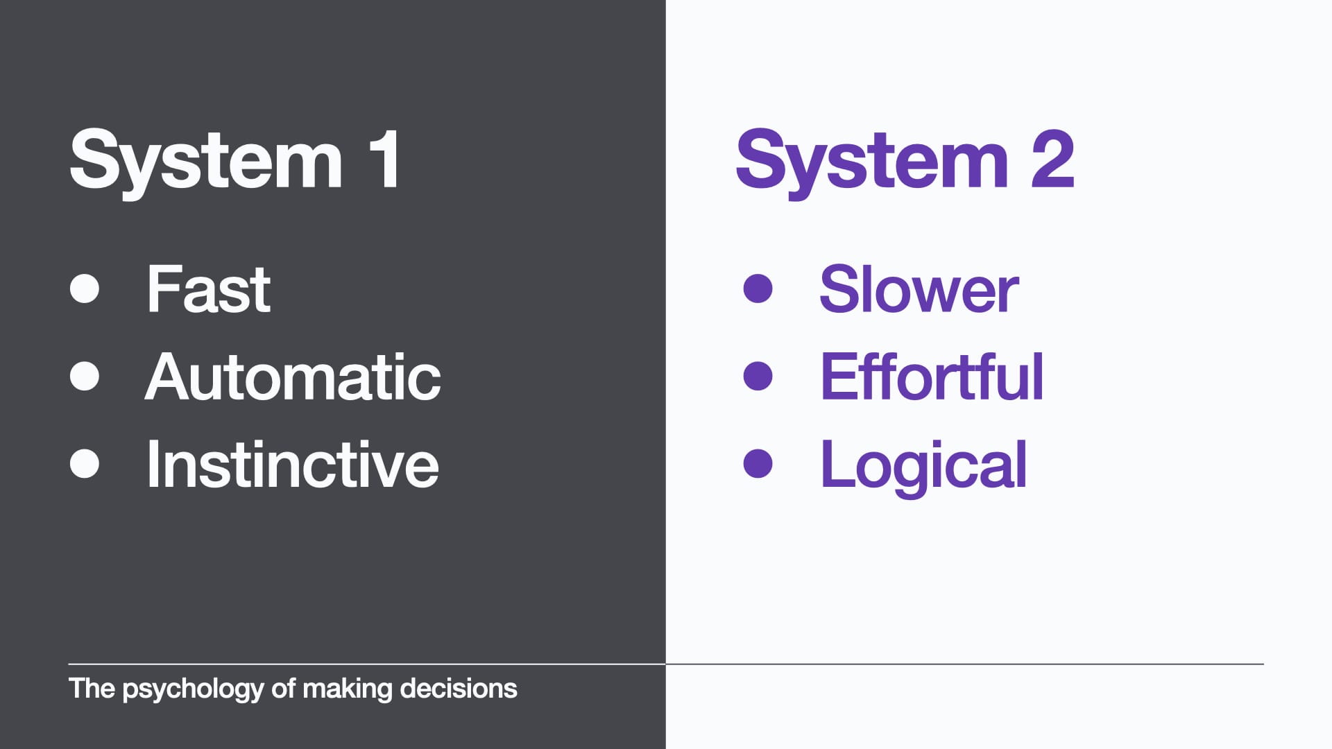 System 2 is slower, it’s when our conscious reasoning kicks in. It’s when we’re being more rational. System 2 is about solving difficult problems, when we’ve taken the time to understand what’s happening and make a conscious choice about what to do next.