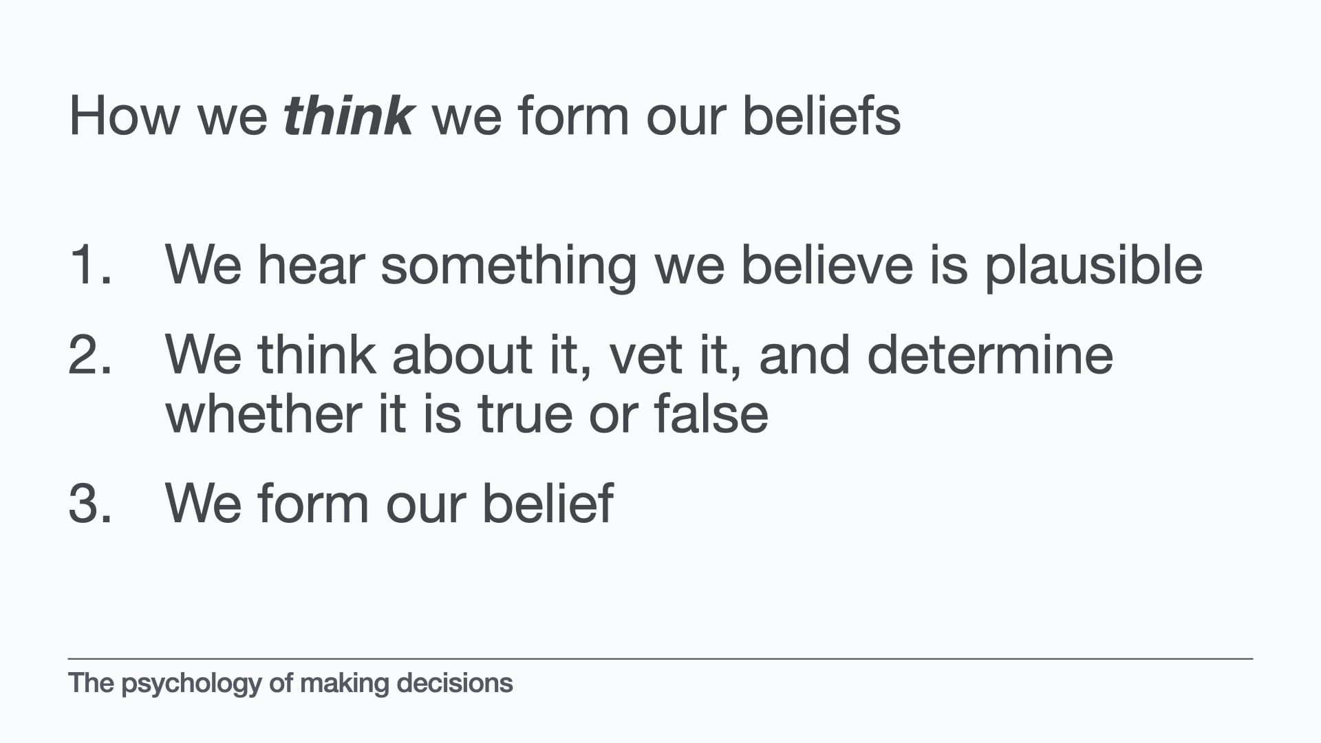 So we’ve explored a bit of the psychology of how we make decisions, based on our beliefs, and just some of the ways that system 1 thinking and cognitive bias and emotions can come into it.