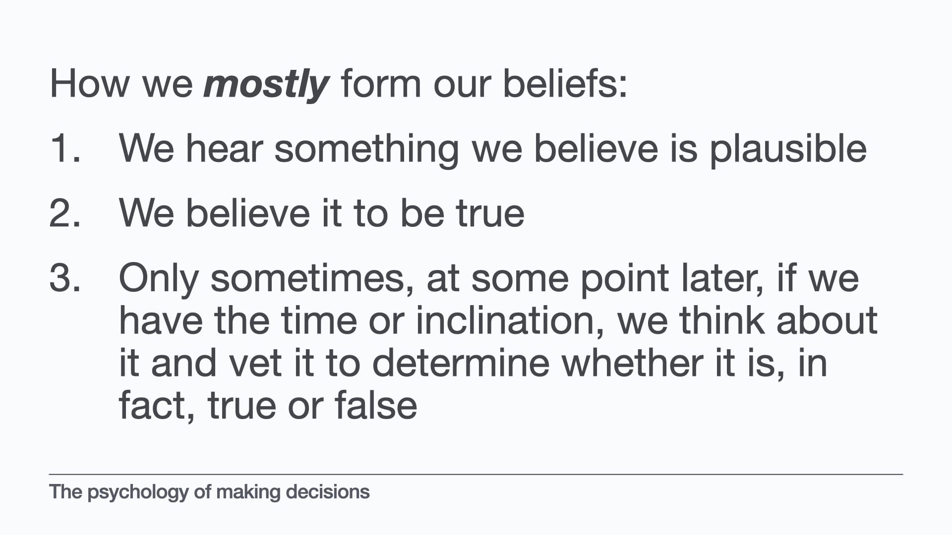 Because we like to think that we are these perfectly rational actors, and we form our beliefs by engaging our system 2 thinking to take in all the relevant information and vetting it, to discover the truth.