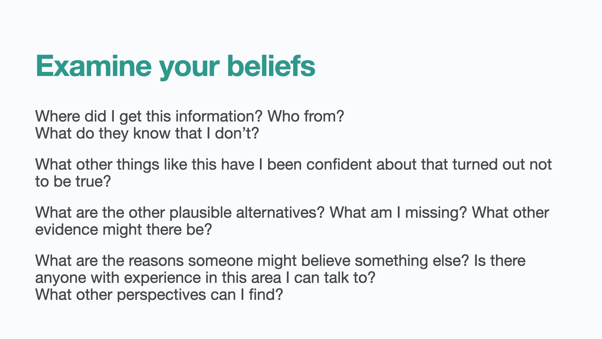Here’s some questions you can ask yourself - or your team - to really interrogate yourself, and your beliefs, to get more information.