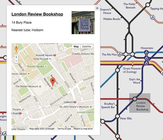 We had a bit more information to play with than the original map, in the form of the links to the websites of the organisations the names were taken from, and we wanted to show those off, but also wanted to make it somehow useful if we could. So we hit upon the idea of showing the linked sites in their position on a Google map in the real world. Thus, you can navigate literary London - buy a book, then find a recommended coffeeshop nearby to read it in while it's grey outside. Hey, you can tell it's the British summertime because everyone's wearing their raincoats.